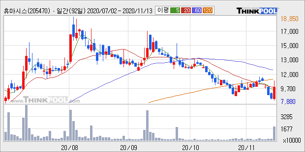휴마시스 : 코로나19 국내 확진 환자 급증 소식에 코로나 19 및 독감 동시 진단키트 생산 사실 부각 추정
