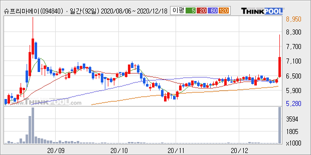 슈프리마에이치큐 : 이재명 차기 대선 지지율 1위 소식에 테마주로 부각 추정