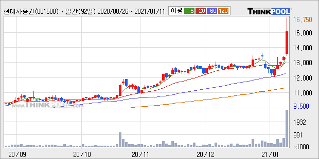 현대차증권 : 주가지수 3천 돌파 이슈에 증권주 강세 추정