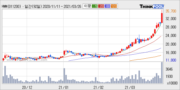 HMM : 수에즈운하 일시 막힘 이슈에 해운 물류대란과 운임 급등 가능성에 강세