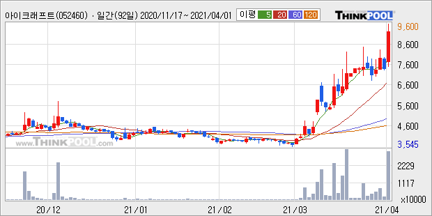 아이크래프트 : 백신여권 수혜 기대감 및 윤석열 테마주로 강세