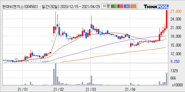 현대비앤지스틸 : 글로벌 철강업종 호황 기대감에 강세 추정.