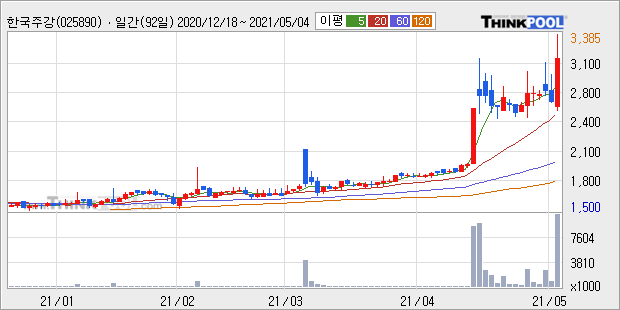 한국주강 : 철강업종 강세에 순환매 상승 추정(일각에서 정치테마주로도 주장).