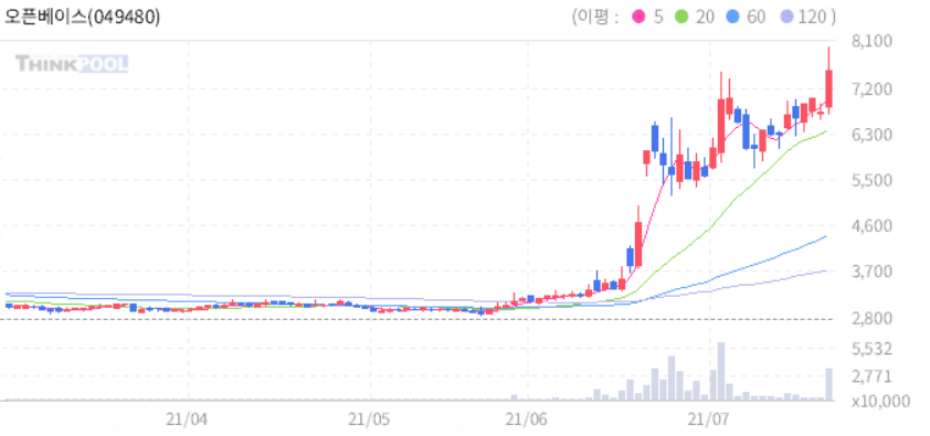 오픈베이스 : 최재형 테마주로 강세.