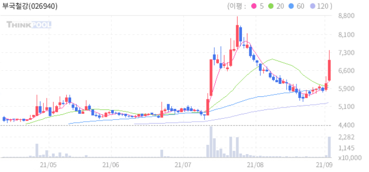 부국철강 : 지난 달 철강 수출 급증 이슈에 강세 추정.