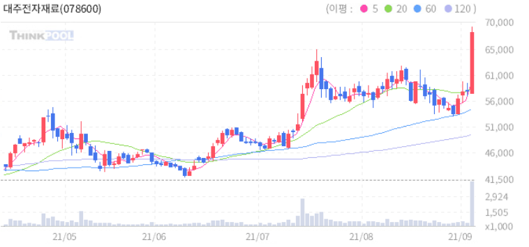 대주전자재료 : LG그룹이 애플 카 TF 참여한다는 소식에 수혜 기대감 추정.